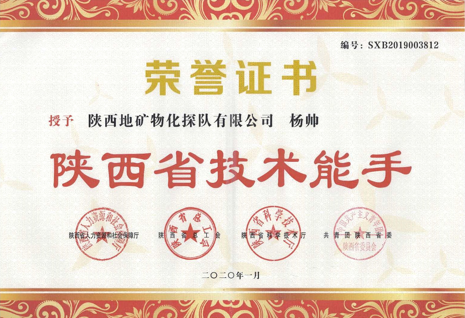 ? ? 陜西省人社廳、省總工會、省科技廳、團省委評比表彰了在2019年舉辦的全省10萬余名職工參加的155個工種的比賽。我公司楊帥取得省級二類大賽140個工種的前三名,榮獲“陜西省技術能手”榮譽稱號。